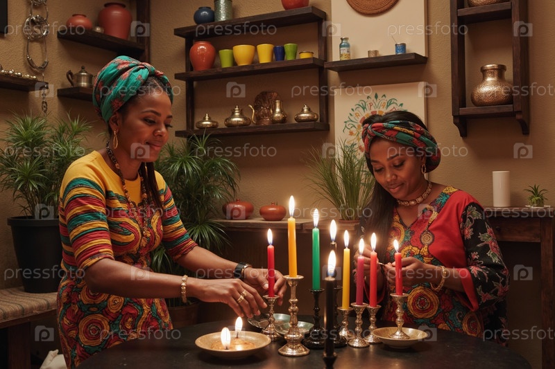 Две молодые взрослые черные женщины зажигают свечи Кинара во время празднования Кванзаа