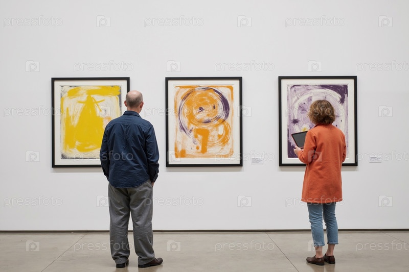 Мужчина и женщина средних лет просматривают абстрактные картины в художественной галерее