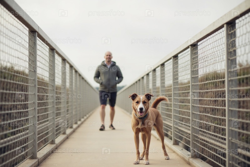 Мужчина среднего возраста гуляет с собакой на мосту На открытом воздухе в дневное время