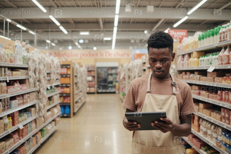 Молодой чернокожий мужчина, носящий фартук с использованием цифрового планшета в проходе продуктового магазина