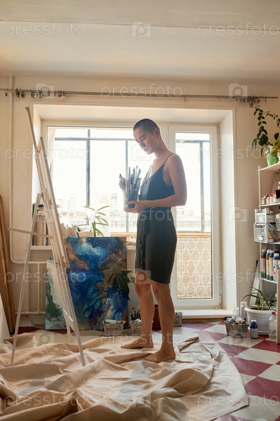Вертикальный длинный снимок профессионального художника, работающего в студии и выбирающего кисти для изображения новых произведений искусства
