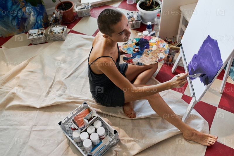 Горизонтальный взгляд под высоким углом молодой женщины с короткими волосами, сидящей на полу в студии