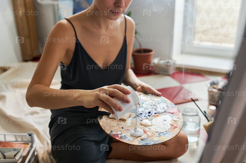 Снимок горизонтального среднего сечения молодого художника, сидящего на полу в студии и добавляющего белую акриловую краску к деревянной палитре