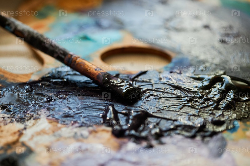 Горизонтальный крупный план без людей из старой кисти, акриловой или масляной краски на деревянной палитре