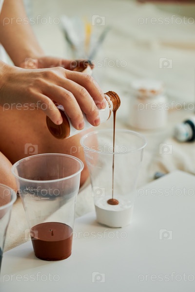 Вертикальный снимок неузнаваемой женщины в белой рубашке, сидящей на полу в студии и наливающей акриловую краску в пластиковые чашки