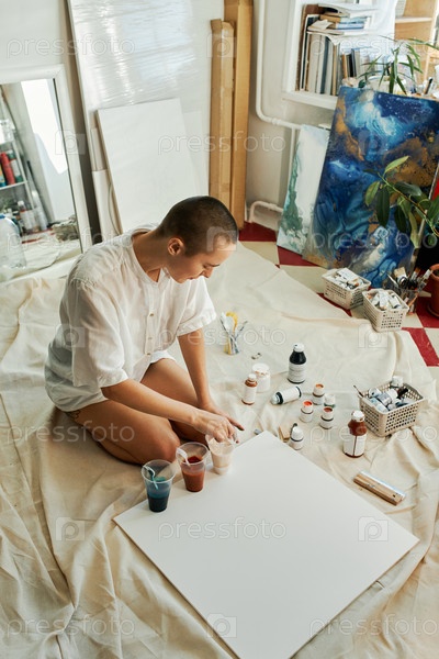 Вертикальный высокоугольный снимок молодой женщины в белой рубашке, сидящей на полу в студии и смешивающей акриловые краски в пластиковых чашках