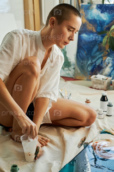 Вертикальный средний снимок молодой женщины с короткими волосами, одетой в белую рубашку, сидящей на полу, работающей над рисунком и думающей о добавлении некоторых цветов