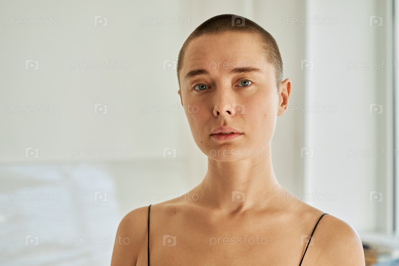 Горизонтальный крупный портрет привлекательной молодой женщины с короткой стрижкой, стоящей в помещении и смотрящей на камеру