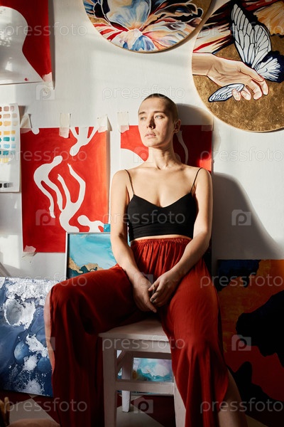 Вертикальный средний длинный портрет молодого профессионального художника, сидящего расслабленно в студии и оглядывающегося в сторону