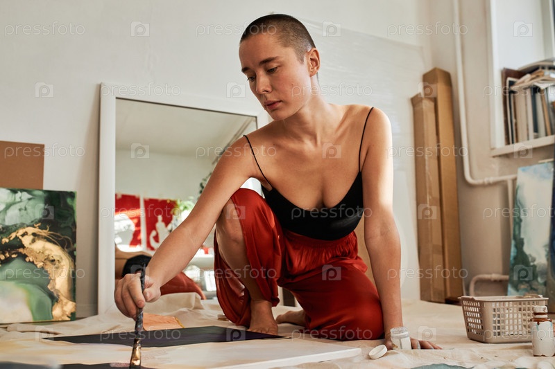 Горизонтальный средний снимок творческой молодой женщины, проводящей время в студии, сидящей на полу и работающей над абстрактной живописью