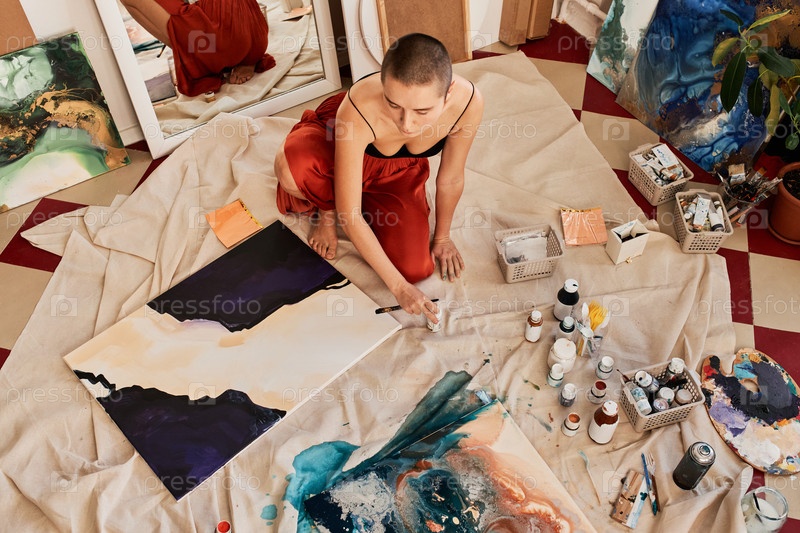 Сверху виден снимок творческого молодого художника, проводящего время в студии, сидящего на полу и работающего над абстрактными картинами