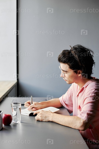 Вертикальный снимок молодого человека в бледно-розовой футболке, сидящего за столом и делающего записи в блокноте