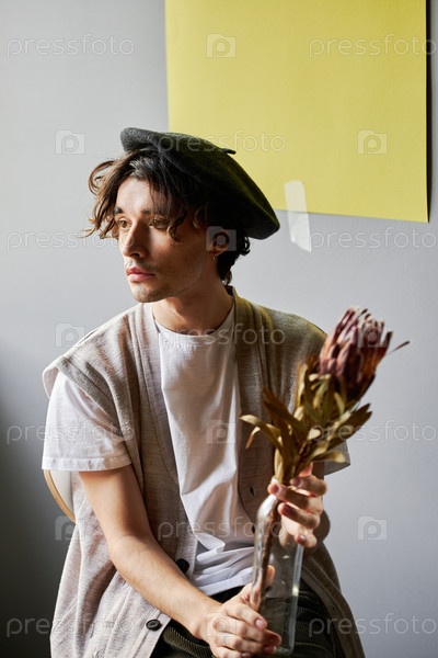 Вертикальный студийный портрет молодого человека в берете, держащего вазу с цветом внутри и оглядывающегося в сторону