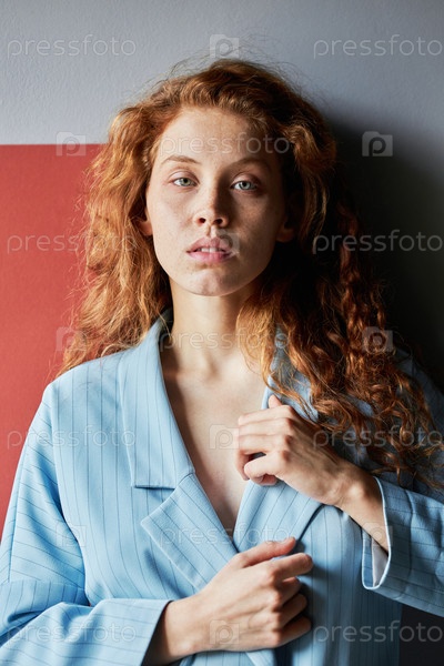 Вертикальный студийный портрет очаровательной молодой женщины с длинными кудрявыми красными волосами, стоящей на бело-красном фоне и глядящей в камеру