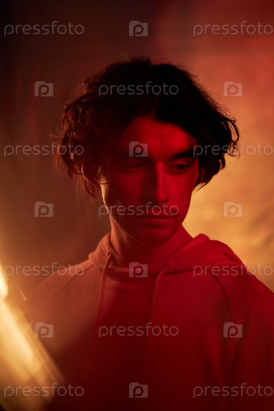 Вертикальный средний блисковый портретный снимок красивого молодого человека с волнистыми волосами, одетого в повседневные наряды, стоящего под красным и оранжевым светом