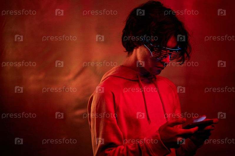 Горизонтальный портретный снимок красивого молодого человека с волнистыми волосами, одетого в капюшон и неоновые очки, стоящего под красным и оранжевым светом, играющего в игру на смартфоне