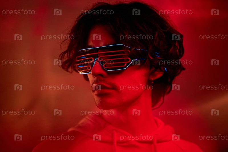 Горизонтальный крупный снимок портрета красивого молодого человека с волнистыми волосами, одетого в капюшон и футуристические неоновые очки, стоящего под красным и оранжевым светом