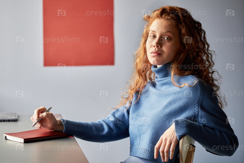 Студийный портрет молодой женщины с длинными рыжими волосами, одетой в голубой свитер, сидящей за столом и записывающейся в блокноте, смотрящей на камеру
