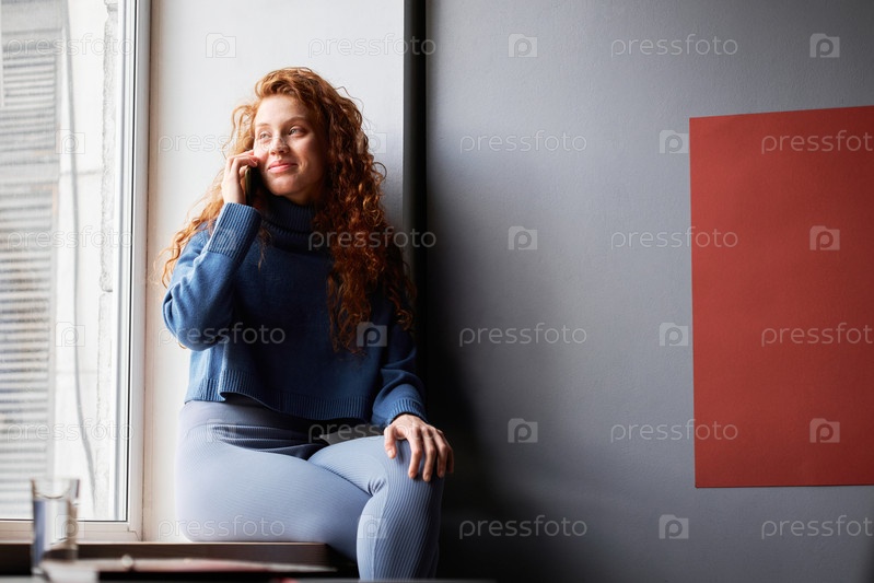 Горизонтальный студийный портрет привлекательной молодой женщины с длинными рыжими волосами, одетой в синий наряд, расслабленно сидящей у окна и разговаривающей по телефону