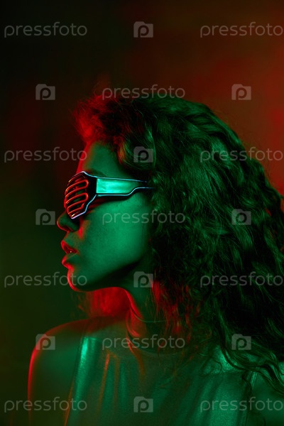 Вертикальный крупный студийный портрет привлекательной молодой женщины с длинными кудрявыми волосами в футуристических очках, стоящей под зеленым и красным неоновым светом