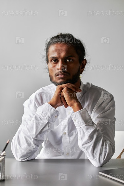 Вертикальный средний портрет красивого молодого индийского мужчины с бородой на лице и носовым пирсингом, одетого в белую рубашку, сидящего в офисной комнате и смотрящего на камеру