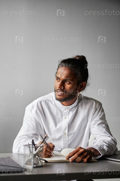 Вертикальный средний портрет красивого молодого индийского мужчины с пирсингом в носу, одетого в модную белую рубашку, сидящего в офисной комнате и работающего над чем-то, оглядываясь в сторону