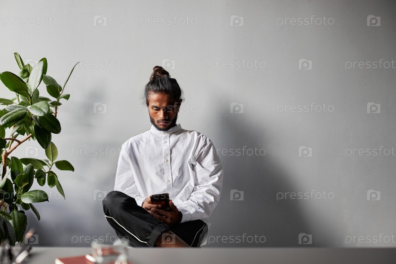 Горизонтальный средний студийный портрет молодого индийского мужчины в стильной белой рубашке, сидящего расслабленно в офисной комнате и серфующего по Интернету на смартфоне