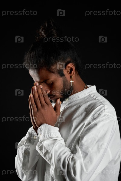 Вертикальный средний студийный портрет религиозного молодого индийского мужчины в стильной белой рубашке, стоящего на черном фоне и молящегося Богу