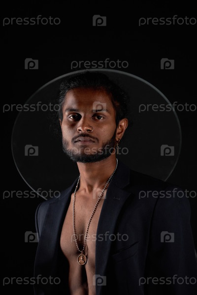 Вертикальный средний студийный портрет уверенного молодого индийского мужчины с мускулистым телом, одетого в черный костюм без рубашки на чёрном фоне