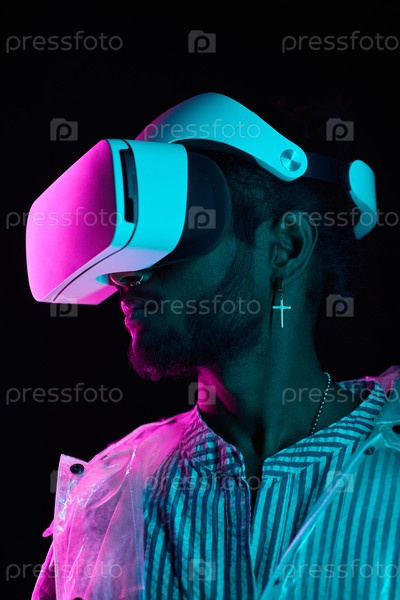 Вертикальный средний ближайший студийный портрет стильного молодого индийского мужчины в гарнитуре VR, стоящего под неоновым светом во тьме