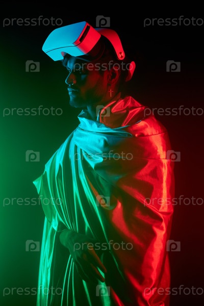Вертикальный средний студийный портрет стильного молодого индийского мужчины в гарнитуре VR и атласной ткани, стоящего под красным и зеленым неоновым светом во время темноты