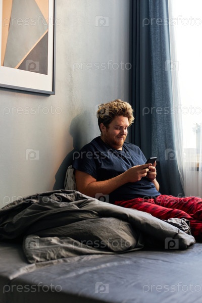 Вертикальный снимок молодого человека в удобной пижаме, сидящего по утрам на кровати и разговаривающего со своей девушкой с помощью мессенджера на смартфоне