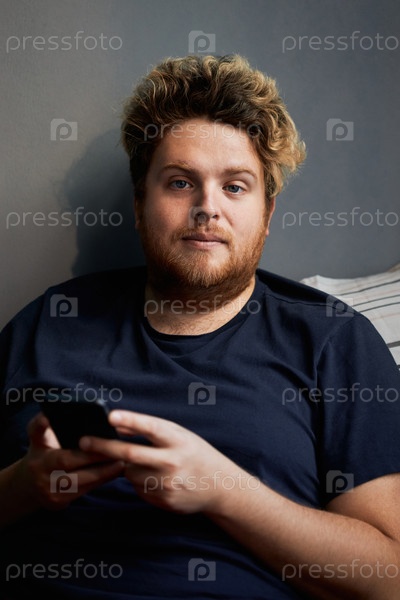 Вертикальный средний снимок красивого бородатого мужчины с светлыми волосами, сидящего утром в постели и держащего смартфон, смотрящий на камеру