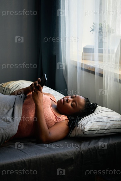 Вертикальный снимок молодой афроамериканской женщины, расслабляющейся в постели утром, держащей смартфон и серфующей по Интернету