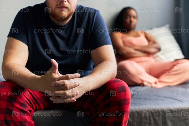 Горизонтальная селективная фокусировка сняла молодого человека и его чёрную подругу, сидящих утром на кровати, игнорируя друг друга после ссоры