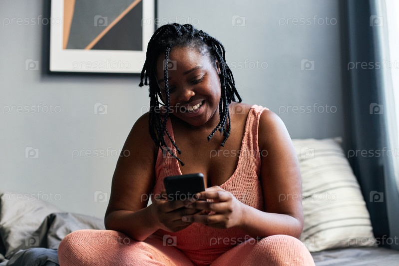 Низкоугольный снимок счастливой молодой чернокожей женщины, сидящей на кровати в спальне и наслаждающейся общением с другом с помощью приложения мессенджера на смартфоне