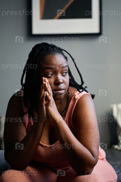 Вертикальный средний кадр задумчивой молодой чернокожей женщины, сидящей на кровати в спальне и оглядывающейся в сторону, думая о чем-то