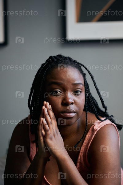 Вертикальный средний крупный план красивой молодой чернокожей женщины, сидящей в спальне дома и смотрящей на камеру