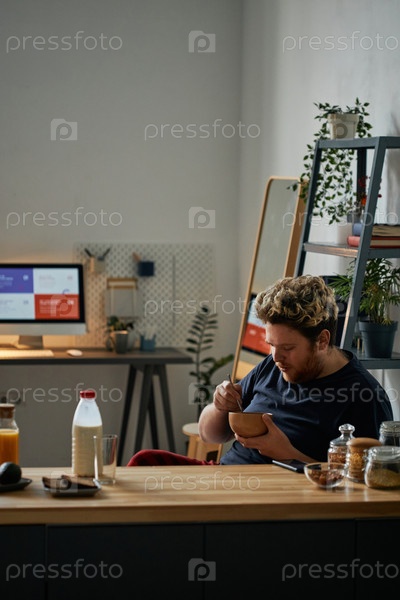 Вертикальный снимок молодого человека, проводящего утро дома, ест овес с молоком на завтрак