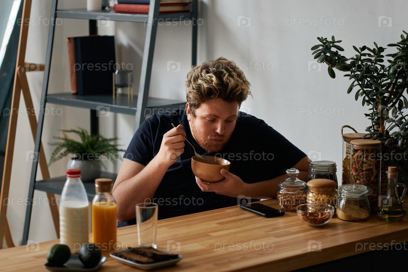 Горизонтальный снимок молодого человека, проводящего утро дома, ест овес с молоком на завтрак и смотрит видео на смартфоне