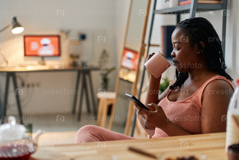 Боковой вид портретный снимок молодой чернокожей женщины, проводящей утро дома, сидящей расслабленной, пьющей чай и смотрящей что-то в Интернете на смартфоне