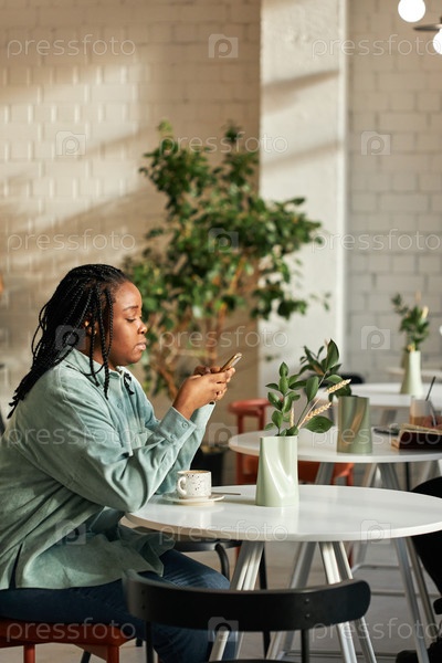 Вертикальный сквозной снимок молодой чернокожей женщины, проводящей обеденный перерыв в современном кафе, серфующей по Интернету на смартфоне