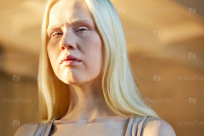 Горизонтальный крупный портрет молодой женщины с альбинизмом, стоящей на дне и оглядывающейся в сторону