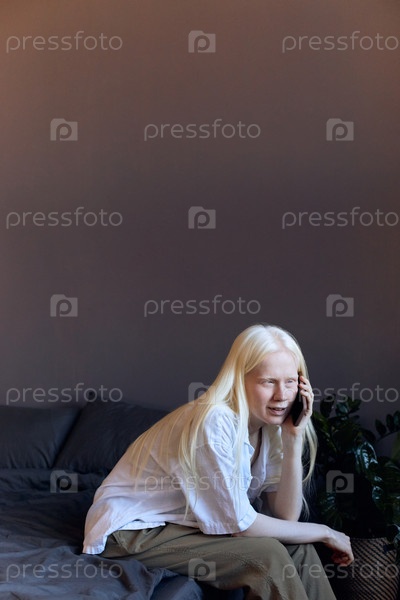 Вертикальный снимок молодой женщины с альбинизмом, сидящей на кровати в верхней спальне и разговаривающей по телефону