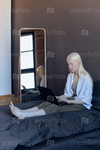 Вертикальный снимок белокожей женщины с альбинизмом, сидящей на кровати в верхней спальне и искавшей что-то в Интернете на ноутбуке