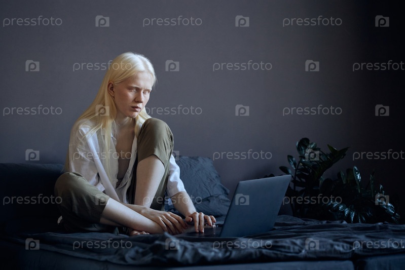 Портрет стильной молодой женщины с альбинизмом, расслабленно сидящей в постели и занимающейся какой-то внештатной работой на ноутбуке