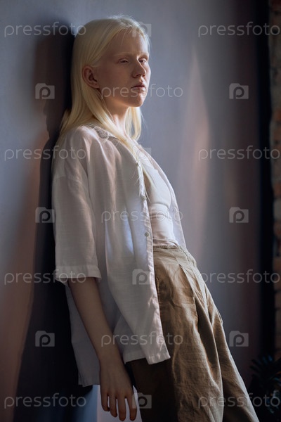 Вертикальный средний длинный снимок привлекательной молодой женщины с альбинизмом в повседневной одежде, стоящей расслабленно прислонившись к стене