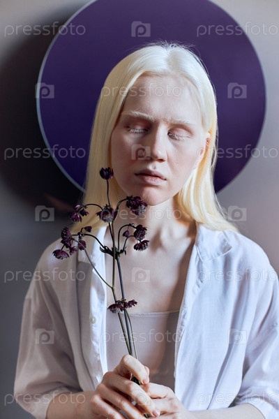 Вертикальный концептуальный студийный портрет молодой женщины с альбинизмом, держащей цветок и стоящей против синего круга в виде нимба со закрытыми глазами