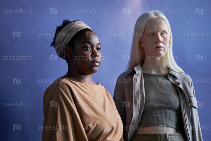 Горизонтальный студийный снимок современной красивой молодой чернокожей и альбиносской женщины, одетой в непринужденную одежду, оглядывающейся в сторону, индиго-синий фон