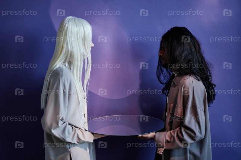 Боковой вид студийного снимка неузнаваемой андрогинной молодой женщины с альбинизмом и длинношерстного индийского мужчины, одетого в непринужденную одежду, держащего зеркало, смотрящее друг на друга